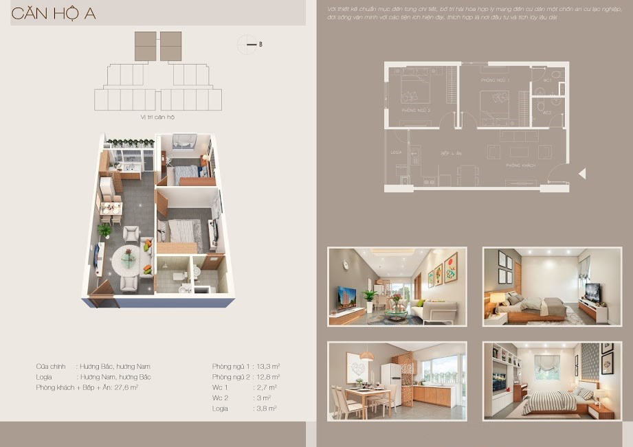 - Căn hộ loại A: diện tích 56,9 m² (2PN – 1WC).