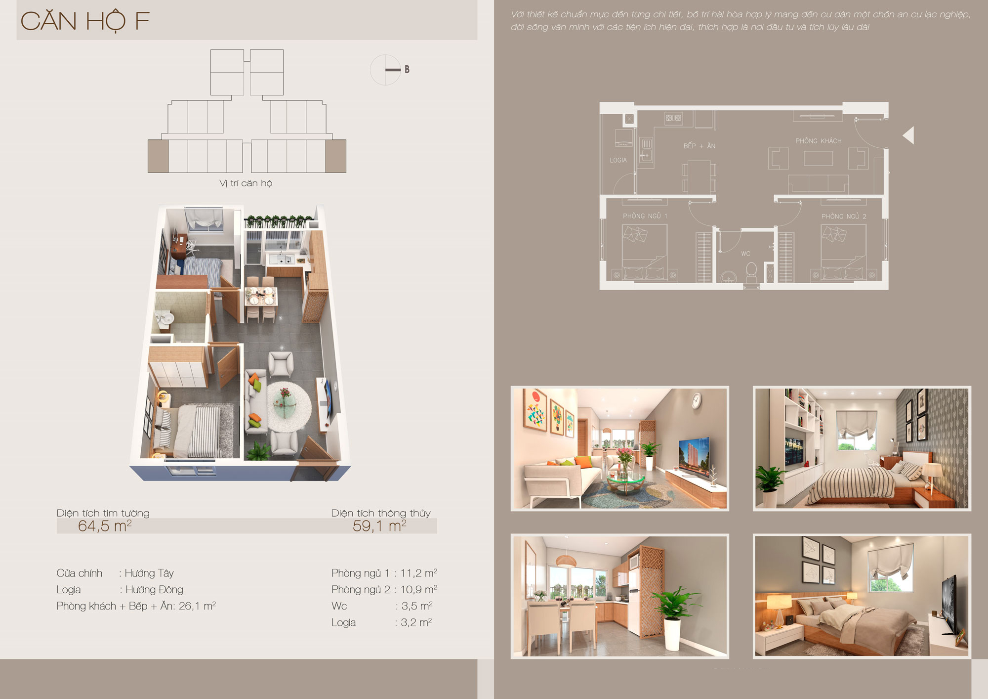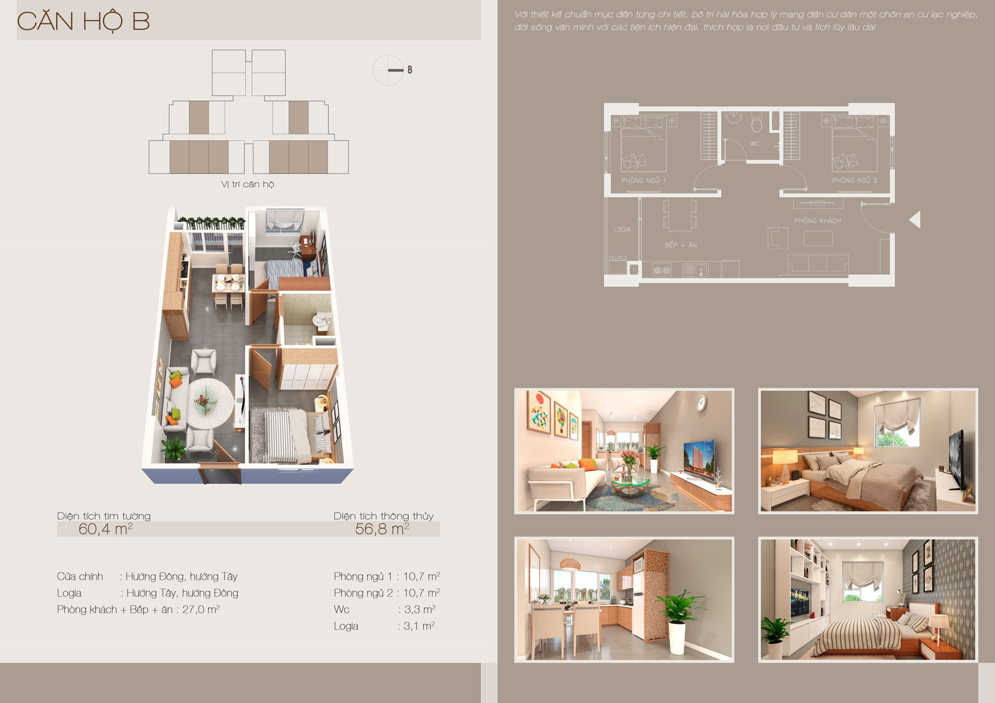 - Căn hộ loại B: diện tích 62,5 m² (2PN – 2WC).